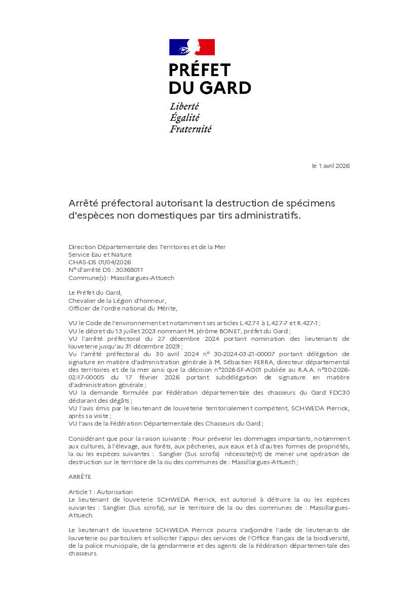 ARRETE PREFECTORAL DESTRUCTION SANGLIERS