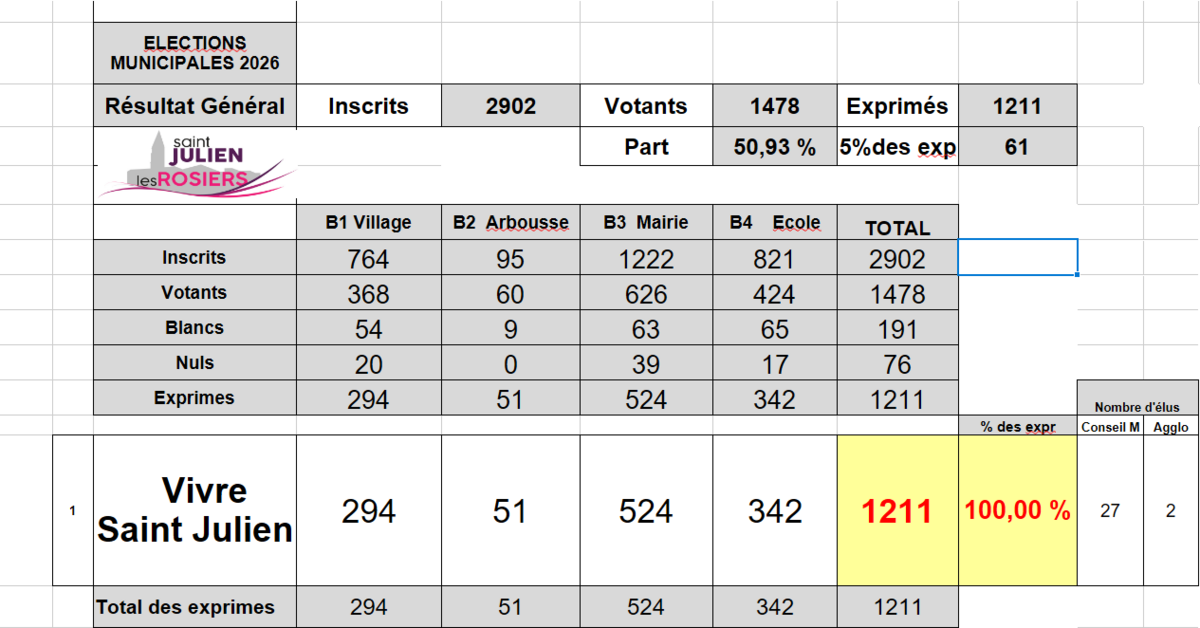 Résultat élections Municipales 15 Mars 2026 3/16/26 Voici le résultat des élections en date du 15 mars 2026 sur notre commune