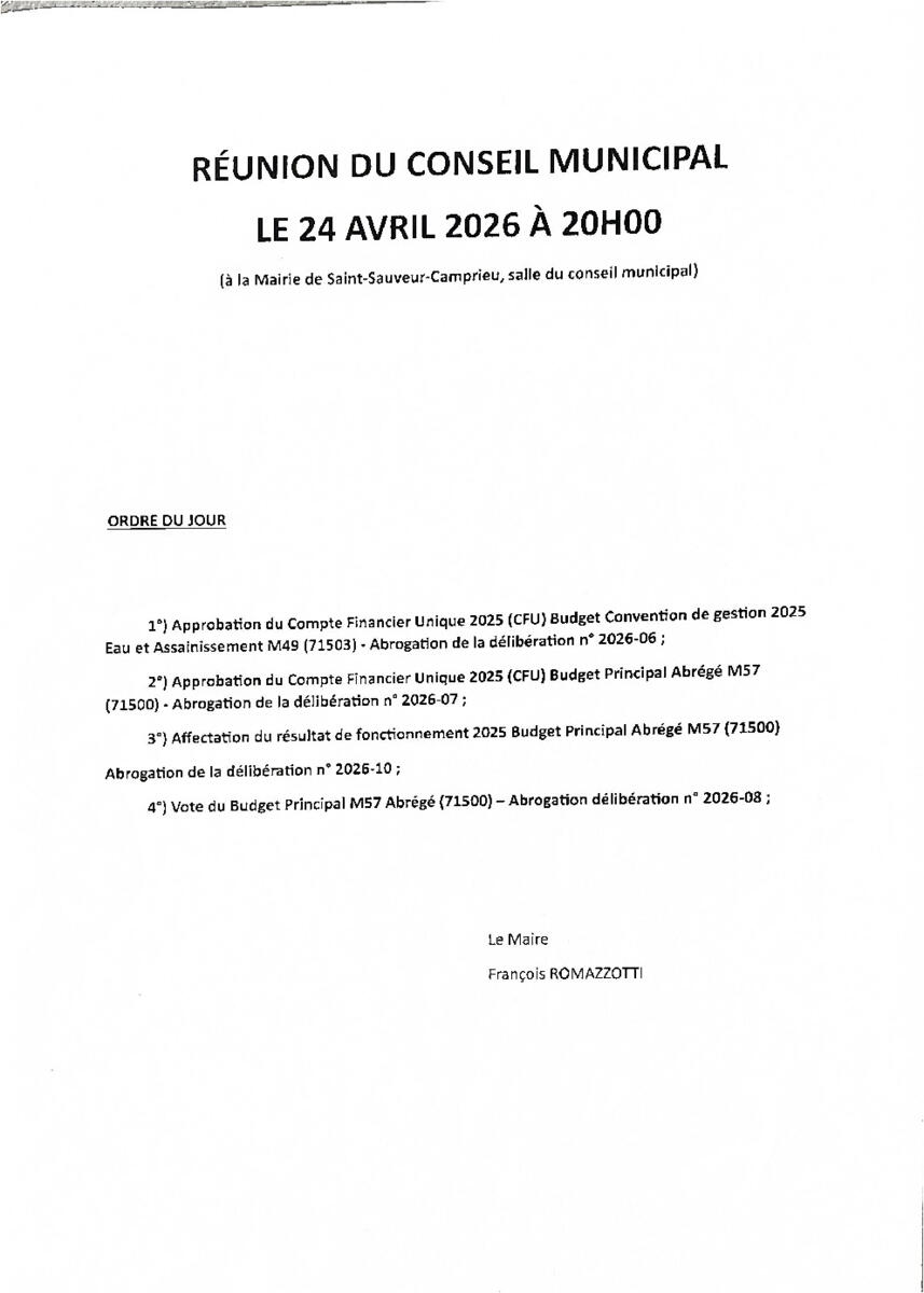 RÉUNION DU CONSEIL MUNICIPAL LE 24 AVRIL 2026 À 20H00