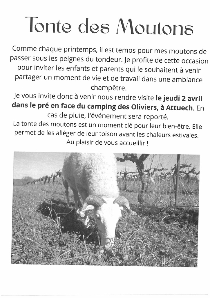 Jeudi 2/04 Tonte des Moutons - Attuech 3/30/26 Jeudi 2 Avril dans le pré en face du camping des oliviers, à Attuech :