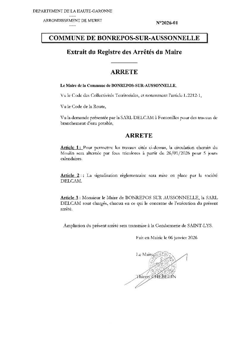 Circulation alternée ch. du Moulin du 26 au 30 janvier