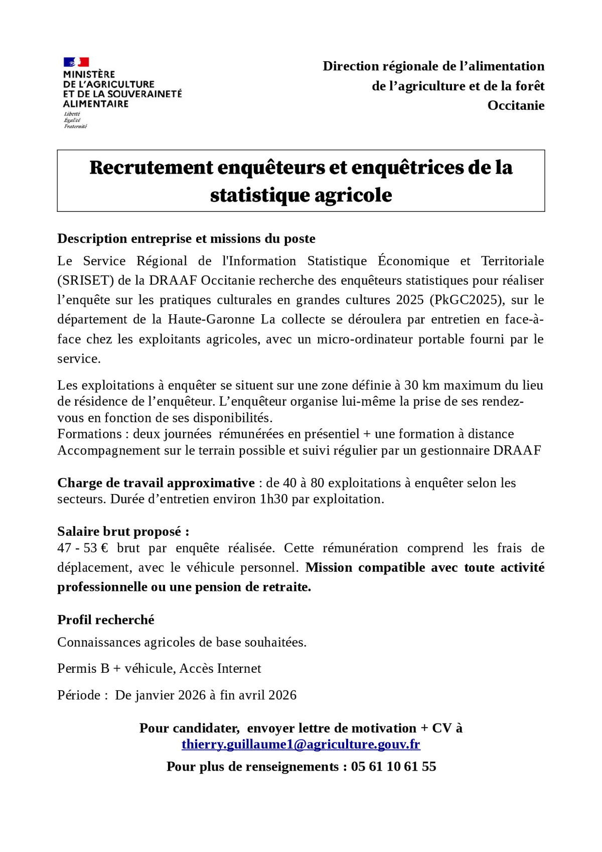 / Recrutement enquêteurs (trices) de la statistique agricole