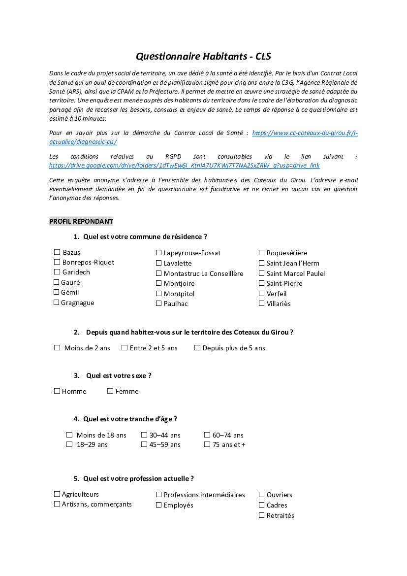Dans le cadre du projet social de territoire et de l’élaboration de son Contrat Local de Santé (CLS), la Communauté de Communes des Coteaux du Girou lance une enquête auprès des habitants.