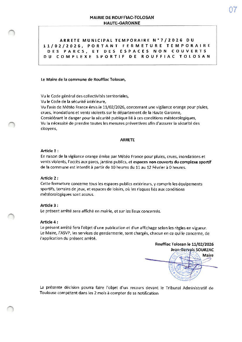 La Mairie vous informe qu’en raison d’une alerte météo de niveau orange pour pluies et vents violents, l’accès aux parcs, jardins publics et espaces non couverts du complexe sportif, sera interdit le 11/02/2026.