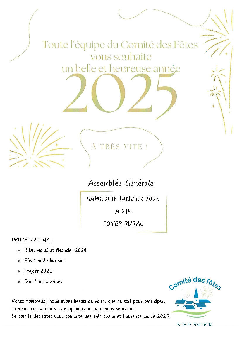 Assemblée générale du comité des fêtes 1/11/25 Assemblée générale du comité des fêtes samedi 18 janvier. Voir flyer.