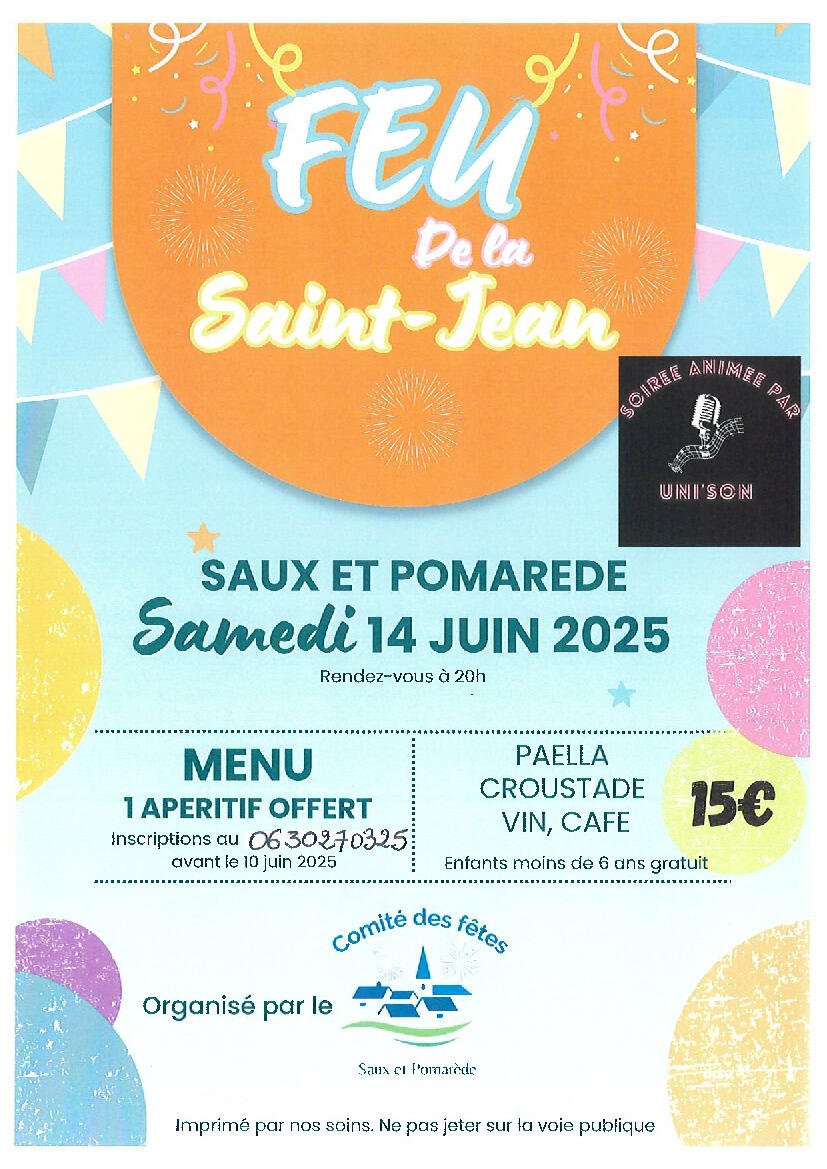Feu de la Saint-Jean samedi 14 juin. Voir flyer.