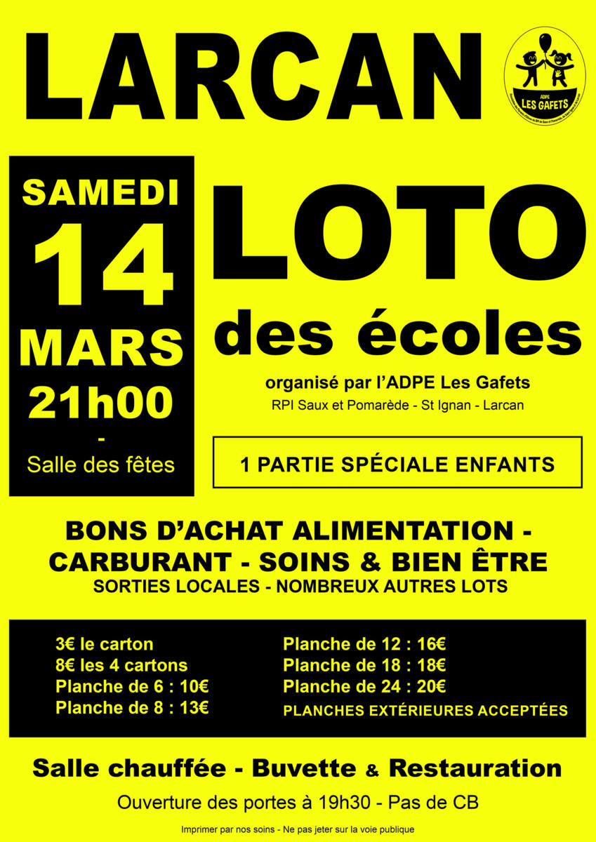L'ADPE (L'association des parents d'élèves) organise le loto des écoles le samedi 14 Mars prochain à la salle des fêtes de Larcan.