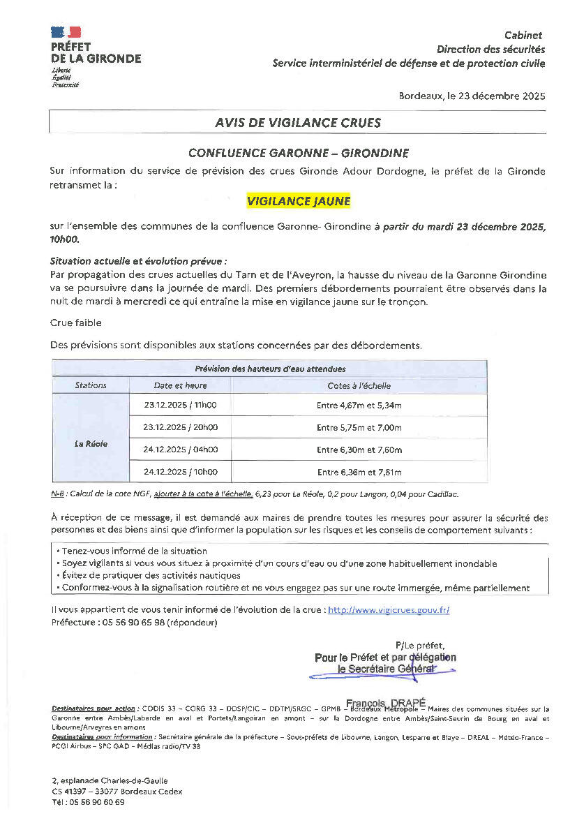 MESSAGE DE LA PRÉFECTURE DE LA GIRONDE : CRUES
