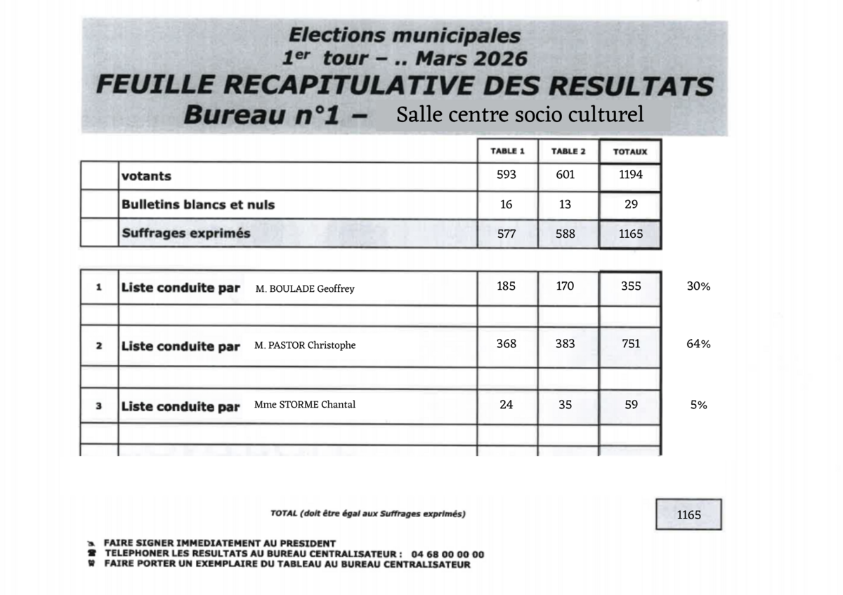 Suite au scrutin organisé le 15 mars, le maire sortant Christophe PASTOR est réélu au 1ᵉʳ tour.