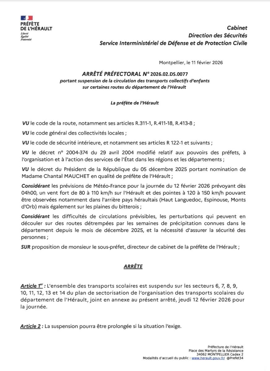 INFO PREFECTURE - SUSPENSION TRANSPORTS SCOLAIRES