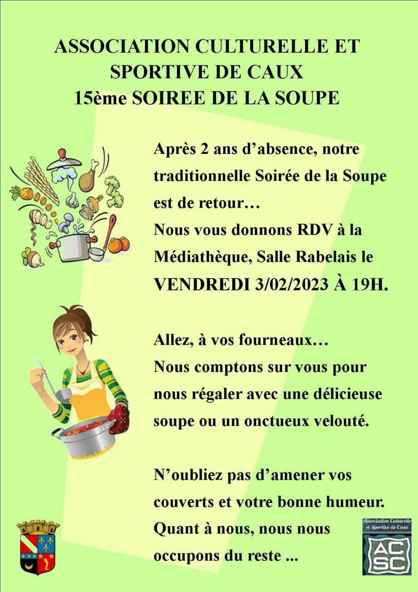 L'association culturelle et sportive de Caux organise sa traditionnelle SOIREE SOUPE vendredi 3 février à 19h à la salle de la médiathèque.