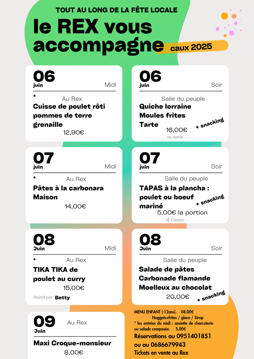 >> Pour les REPAS, ils sont préparés par LE REX, les midis (au restaurant, dans la rue de l'Egalité fermée à la circulation) et les soirs (parking salle du Peuple) voir l'affiche 2 ci-jointe.