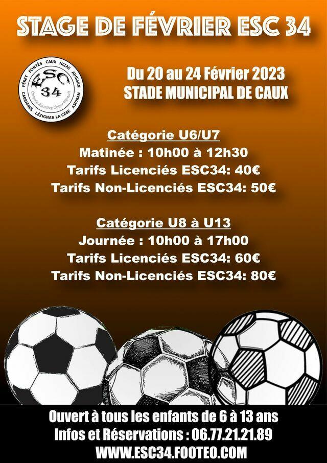 L'Entente Sportive Coeur Hérault - ESC 34 organise un nouveau stage de football pour les 6 à 13 ans du 20 au 24 février, sur le stade d'honneur de CAUX.