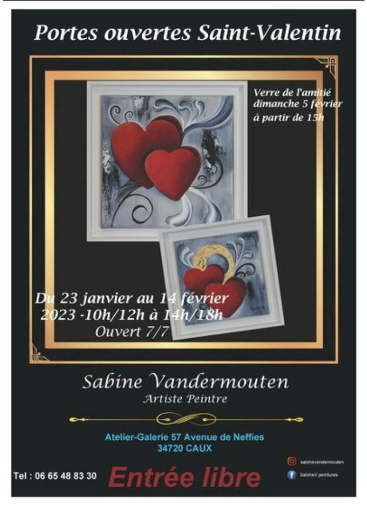 Sabine Vandermouten, artiste peintre, expose son œuvre à son domicile aménagé en galerie et en atelier au 57 av. de Neffies (Caux, sortie du village après l'abri-bus).