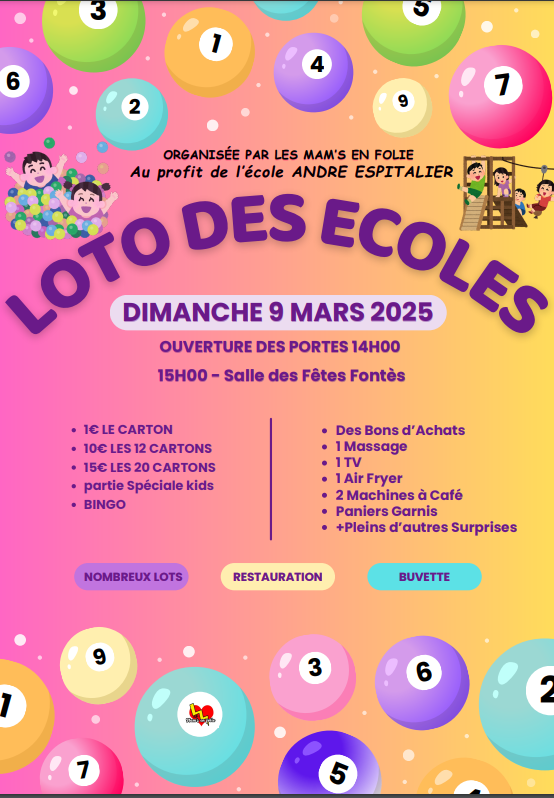 L'association les Mam's en folie organise, en faveur de l'école André Espitalier, le LOTO DES ÉCOLES.