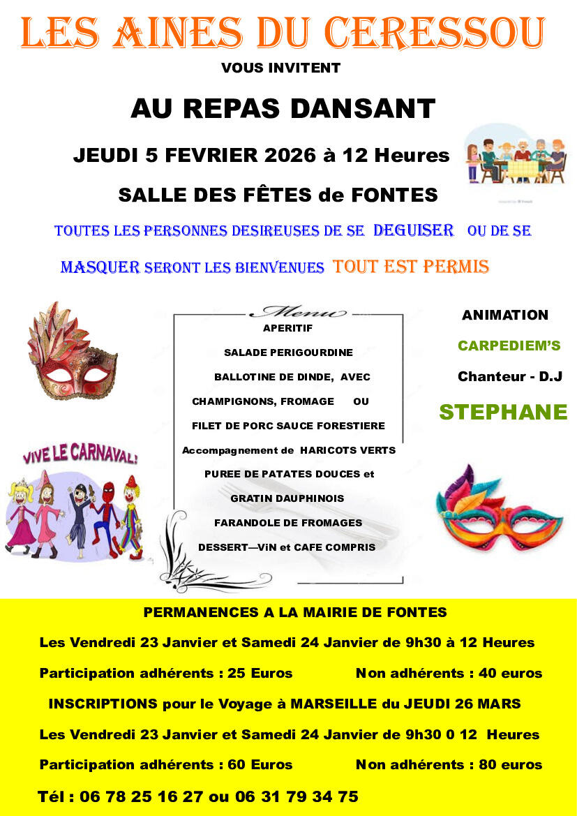 L'association les Aînés du Céressou organise un repas dansant, jeudi 5 février à 12h00 à la salle des fêtes de Fontès.