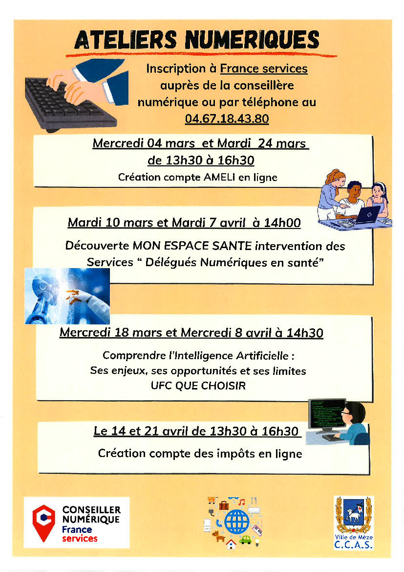 ATELIERS NUMERIQUES MARS ET AVRIL 3/9/26 En mars et avril, la conseillère numérique de l'antenne France Services propose un programme d'ateliers gratuits et ouverts à tous.