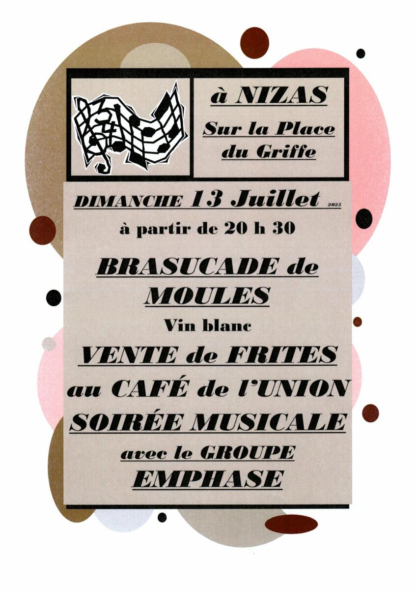 Brasucade de moules place du Griffe à Nizas , dimanche 13/07 à partir de 20h30