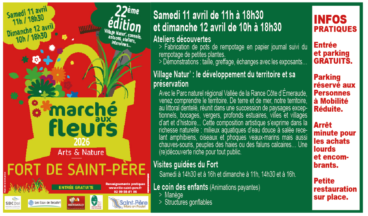 Marché aux fleurs 4/11/26 Samedi 11 avril 11h / 18h30 Dimanche 12 avril 10h / 18h30 au FORT de ST-PERE Source : Mairie de Saint-Père-Marc-en-Poulet
