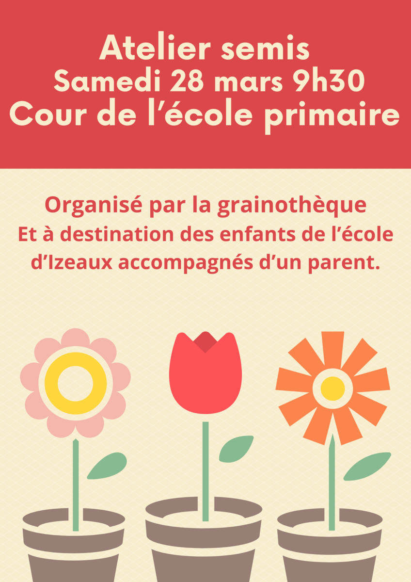 La grainothèque invite les enfants des écoles accompagnés d'un parent à l'atelier semis le 28 mars à 9h30 dans la cour de l'école primaire.