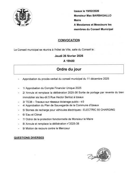 CONSEIL MUNICIPAL 2/20/26 Le conseil se réunira à l'hôtel de Ville, salle du Conseil : Jeudi 26 février 2026 A 19h00