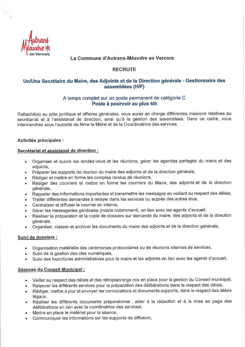 - Secrétaire du maire, des adjoints et de la direction générale - gestionnaire des assemblées (H/F)