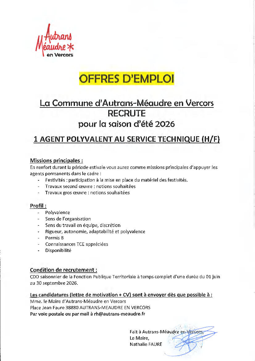 Envoyez vos candidatures (CV + LM) à rh@autrans-meaudre.fr