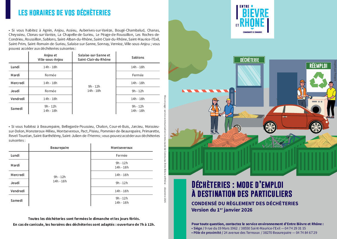 Pour plus d’informations sur le fonctionnement des déchèteries d’Entre Bièvre et Rhône : jours et horaires d’ouverture, déchets acceptés ou interdits, véhicules autorisés à accéder en déchèterie…