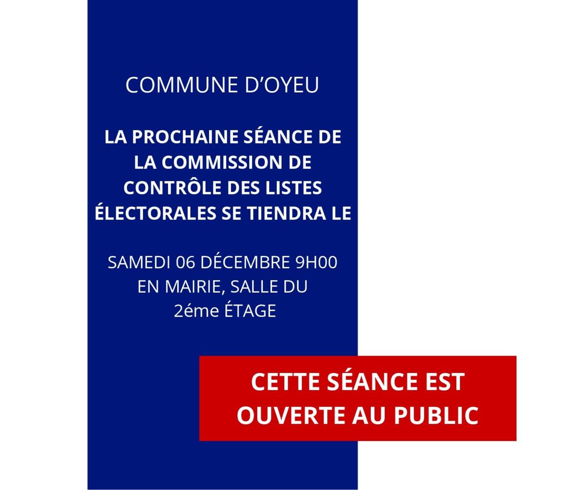 La prochaine séance de la commission de contrôle des listes électorales se tiendra le 6 décembre à 9h00, à la mairie (salle du 2ème étage)