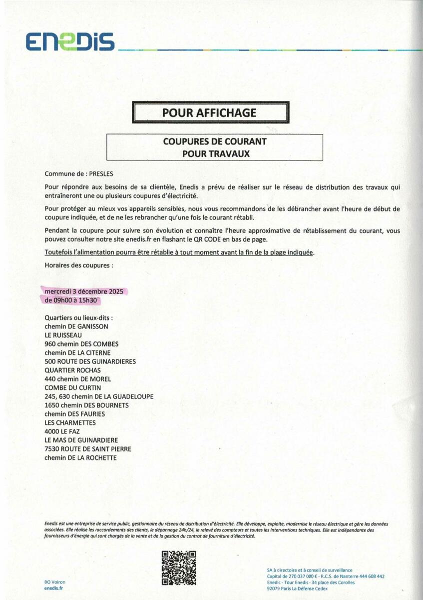 COUPURES DE COURANT POUR TRAVAUX - 3 DECEMBRE -