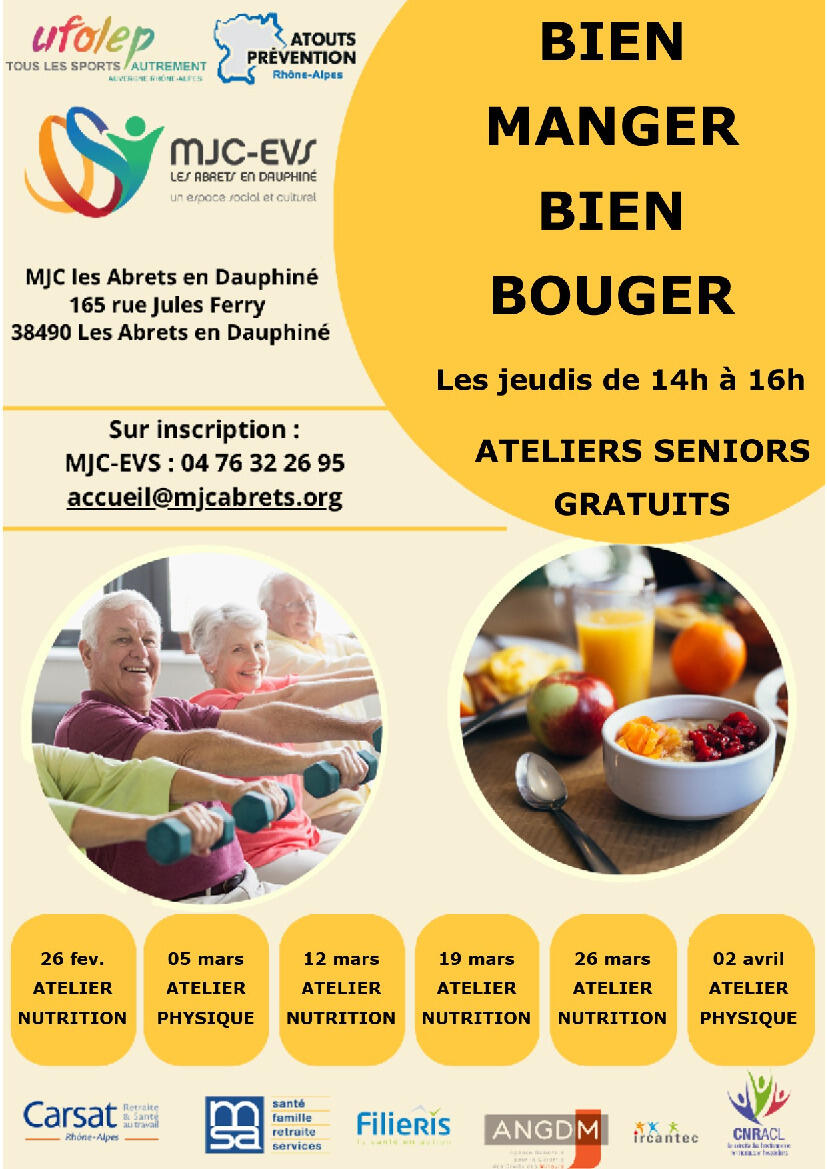 Des atelier séniors gratuits "Bien manger, bien bouger" sont organisés les jeudis 26 février, 05, 12, 19 et 26 mars et jeudi 02 avril 2026 de 14h à 16h aux Abrets en Dauphiné.