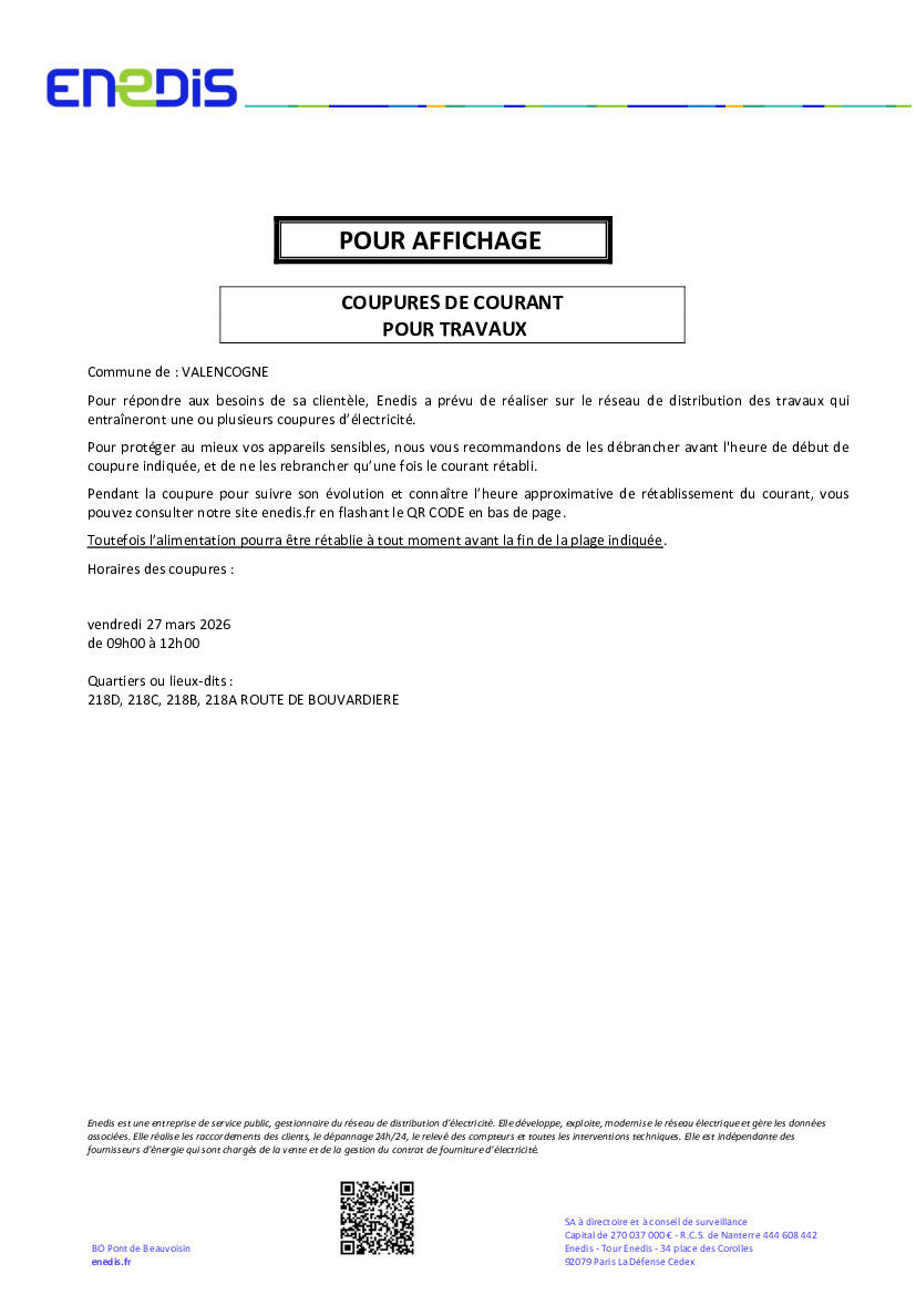 Enedis informe d'une coupure de courant pour travaux 27/03