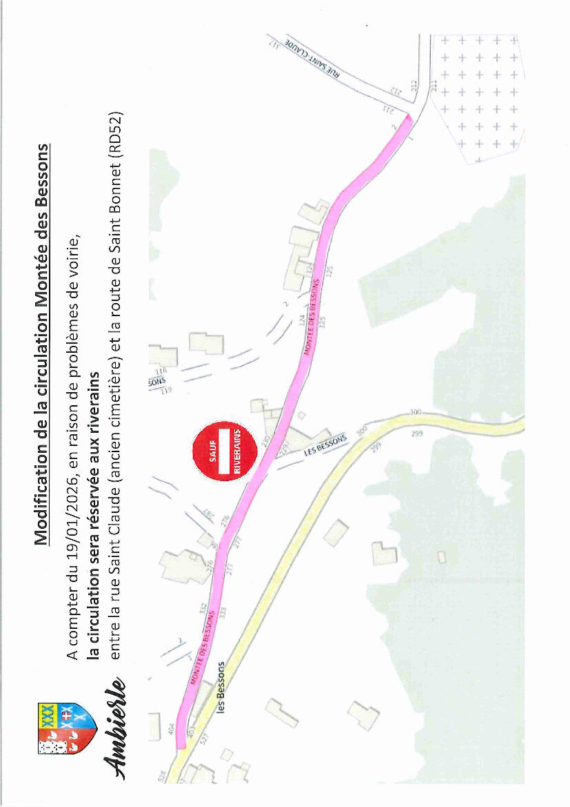 A compter de demain, lundi 19 janvier 2026, la Montée des Bessons est interdite à la circulation dans les deux sens exception faite pour les riverains depuis l'ancien cimetière jusqu'à la route de Saint Bonnet (D52).