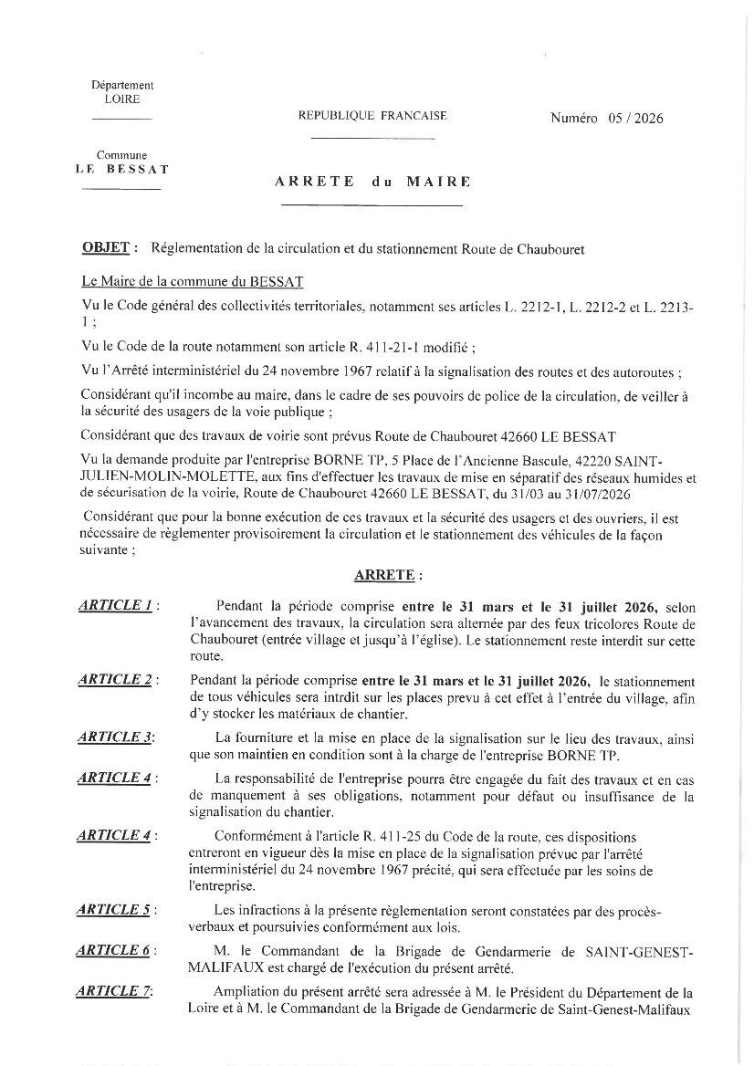 Your town hall / News / Arrêté de circulation Route de Chaubouret