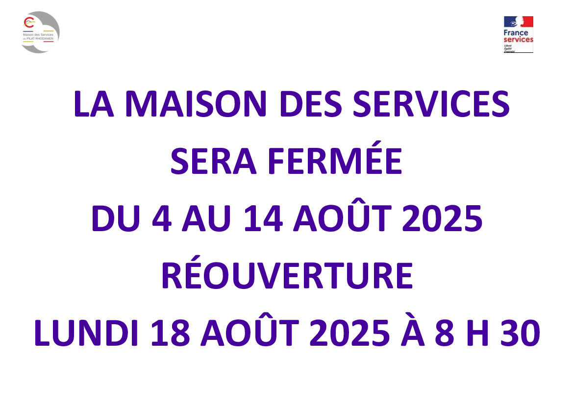Pour information, La Maison France Services du Pilat Rhodanien sera fermée du 4 au 14 août inclus. Réouverture le LUNDI 18 Août à 8 H 30.