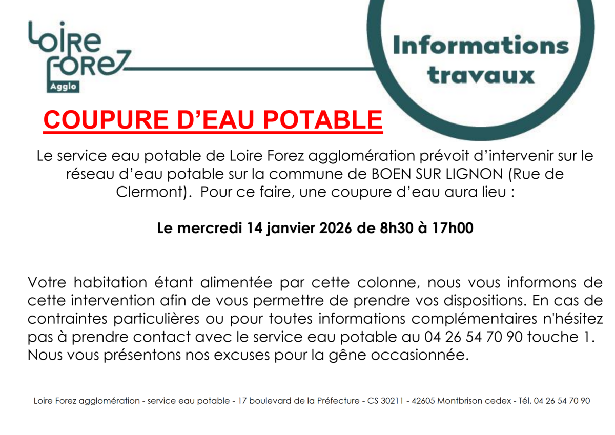 INFORMATION : Coupure d'eau potable 1/13/26 Mercredi 14 janvier 2026 de 8h30 à 17h. Secteur impacté : Rue de Clermont