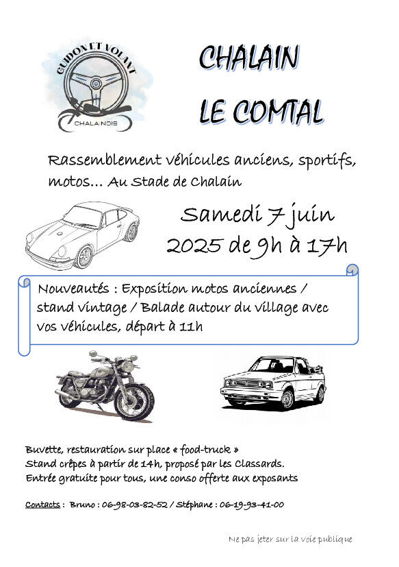 L'association Guidons et Volants Chalainois organise un rassemblement de véhicules anciens, sportifs, motos... au stade de Chalain-le-Comtal le samedi 7 juin 2025 de 9h à 17h.