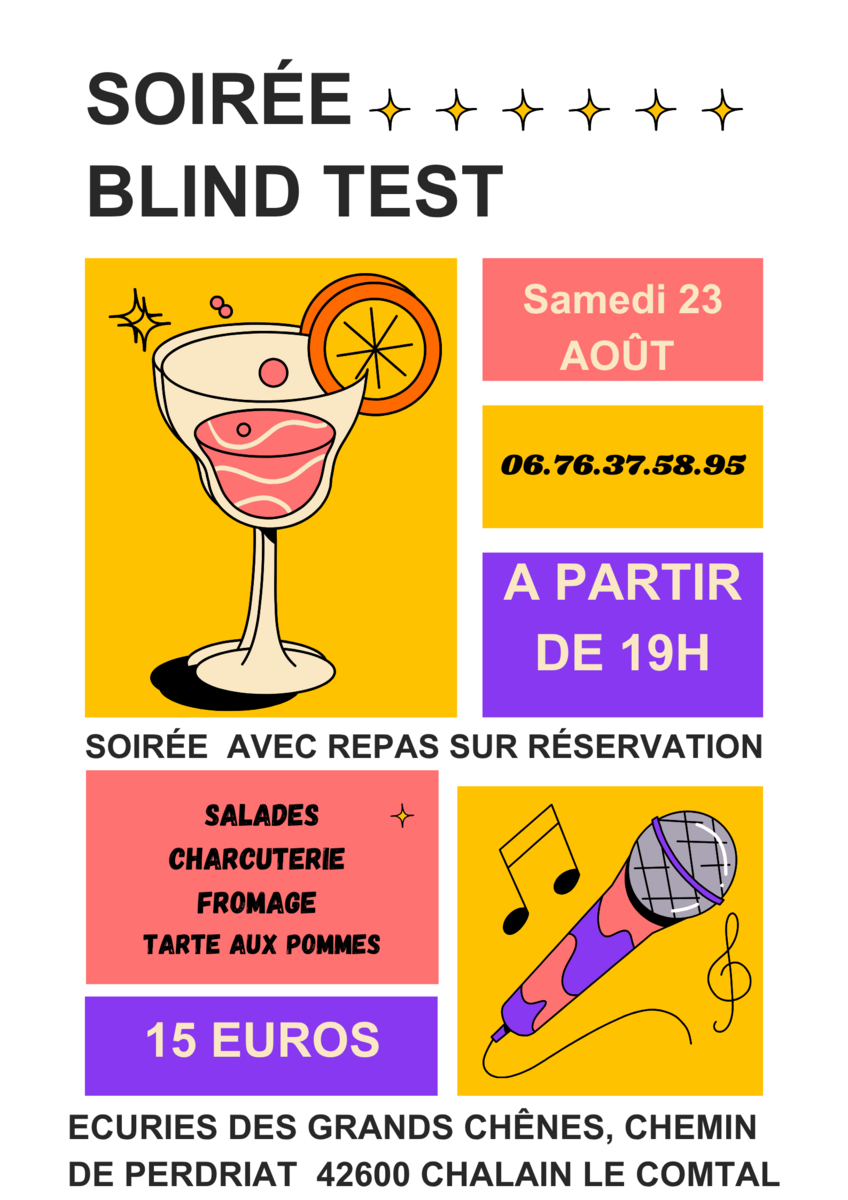 Les écuries des grands chênes organisent une soirée Blind Test le samedi 23 aout 2025 à partir de 19 heures.