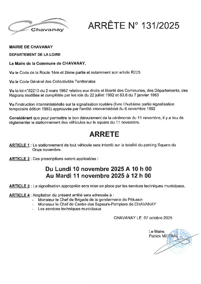 Pour le bon déroulement de cette manifestation, le stationnement est interdit square du 11 novembre du lundi 10/11 à 10h00 au mardi 11/11 à 12h00.