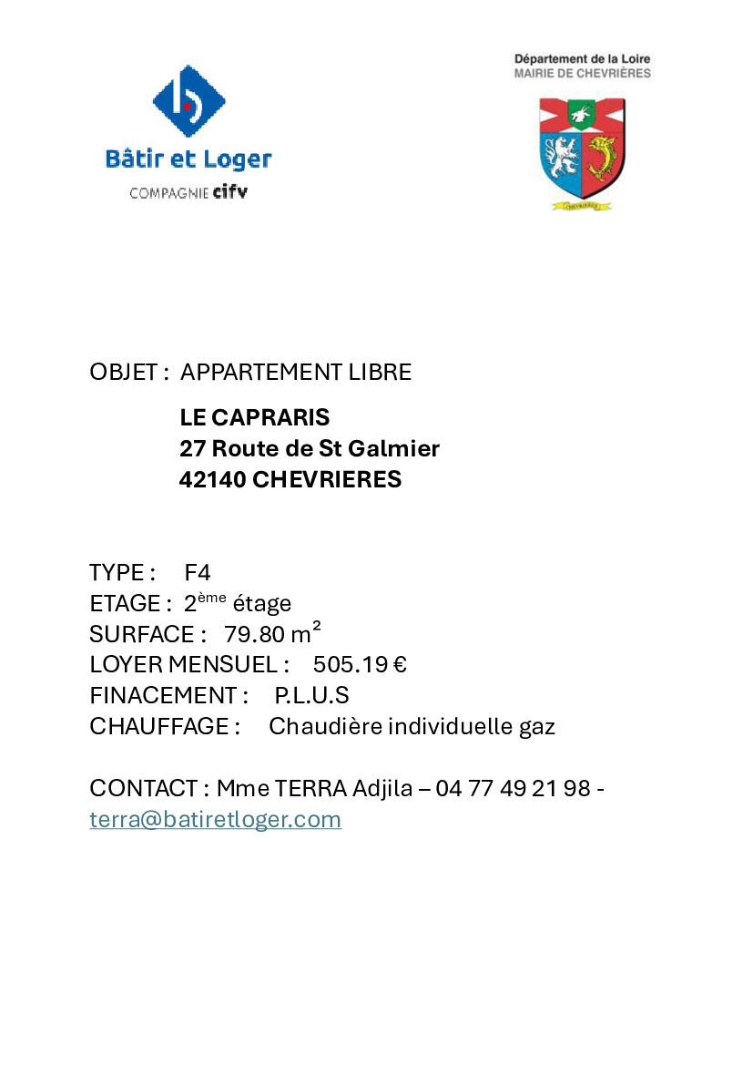 📢 APPARTEMENT LIBRE – CHEVRIÈRES