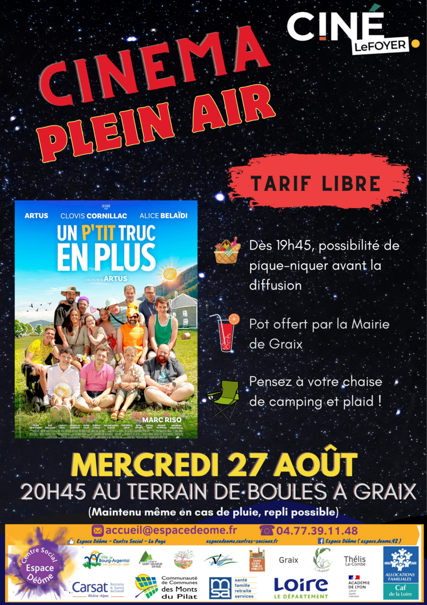 Après un report météorologique, la séance de ciné plein air est programmée le mercredi 27 août à 20h45 au terrain de boules à Graix.