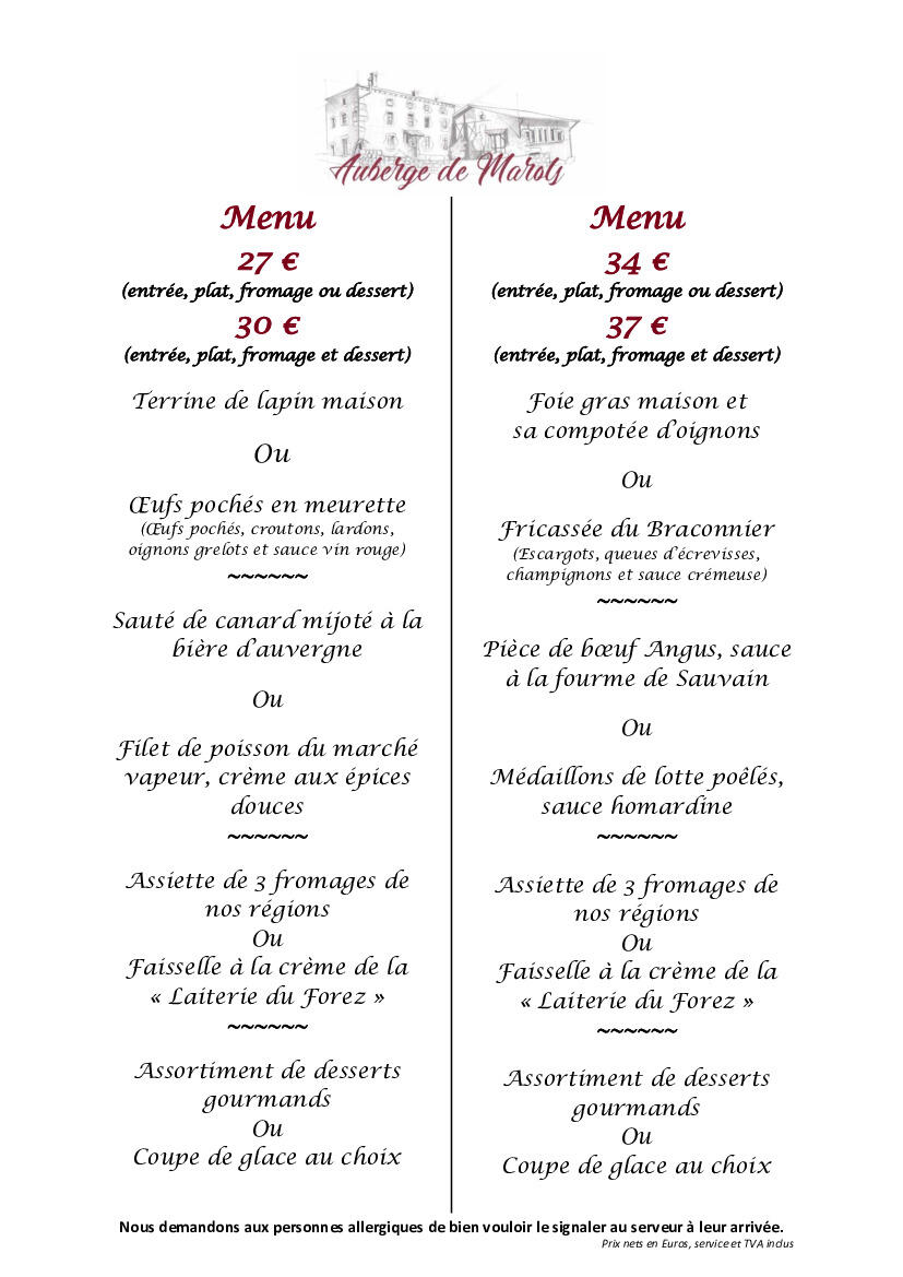 L'auberge de Marols est ouverte en ce week-end de pâques avec ces menus habituels, vous pouvez également retrouver notre formule du midi a 17€ servi du lundi au vendredi.