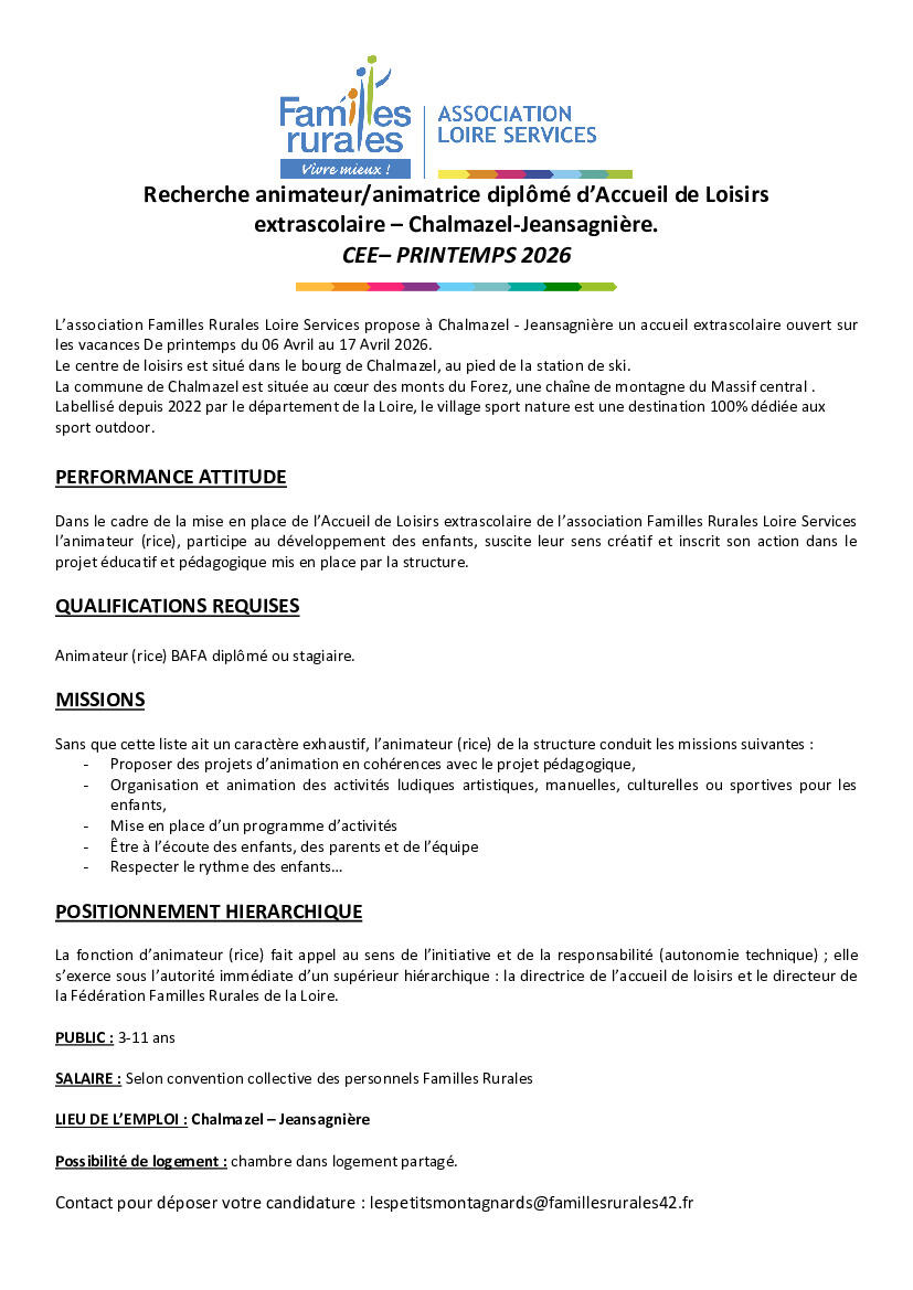 Centre de Loisirs : Offre d'emploi vacances d'avril
