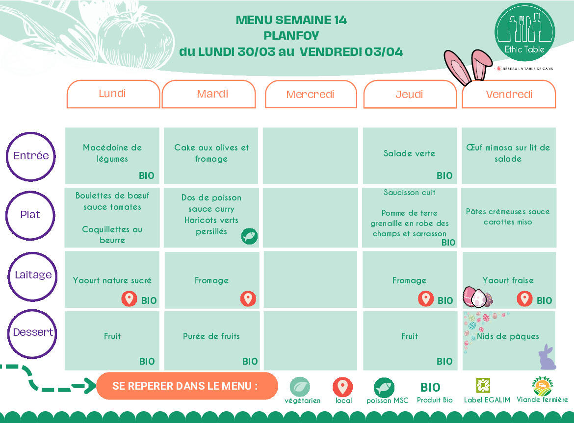 Menus de la semaine du 30 mars au 03 avril