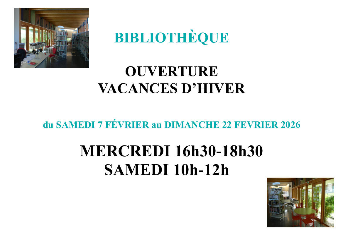 Horaires De La Bibliothèque - Vacances D'hiver 12/02/2026 Bonjour à tous, pendant les vacances d'hiver, c'est avec plaisir que nous vous accueillerons à la bibliothèque les mercredis de 16h30 à 18h30 les samedis de 10h à 12h. L'équipe de la bibliothèque de Planfoy