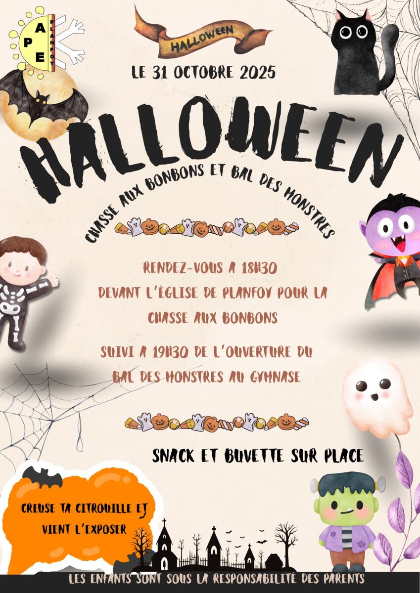 Pour fêter Halloween, l'APE vous donne rdv le 31 octobre 2025 à 18h30 devant l'église du village afin de participer à la chasse aux bonbons et au bal des monstres