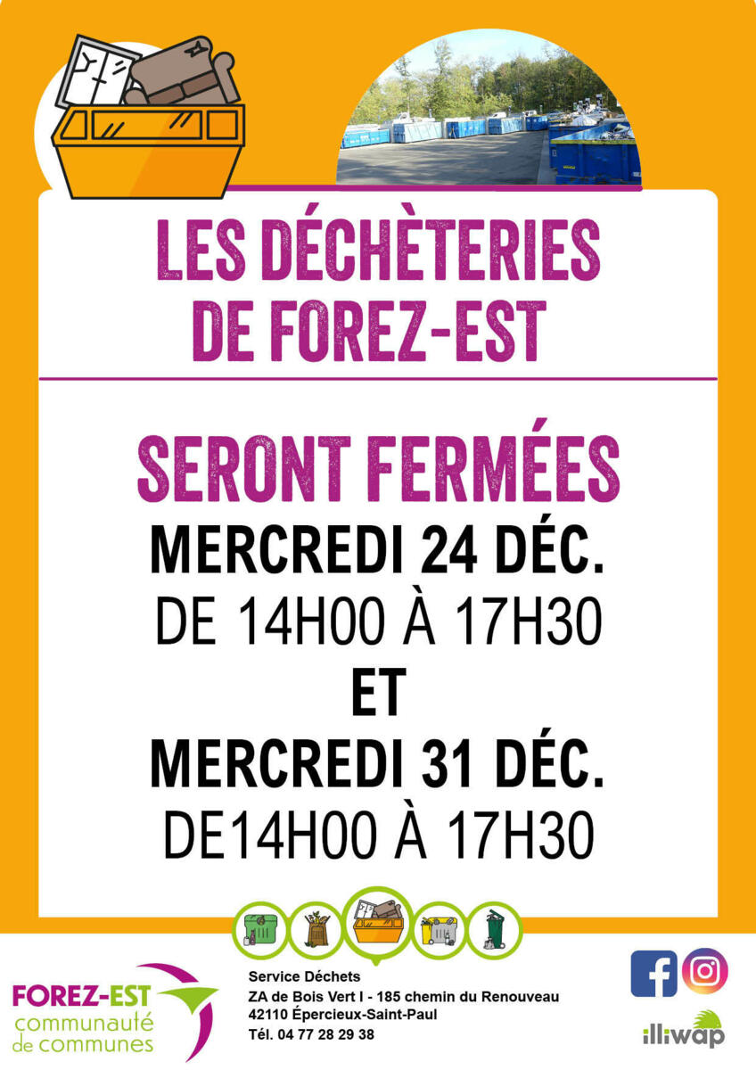 Les déchèteries de Forez-Est (Chazelles-sur-Lyon, Épercieux-Saint-Paul, Feurs, Montrond-les-Bains et Panissières) seront fermées exceptionnellement :