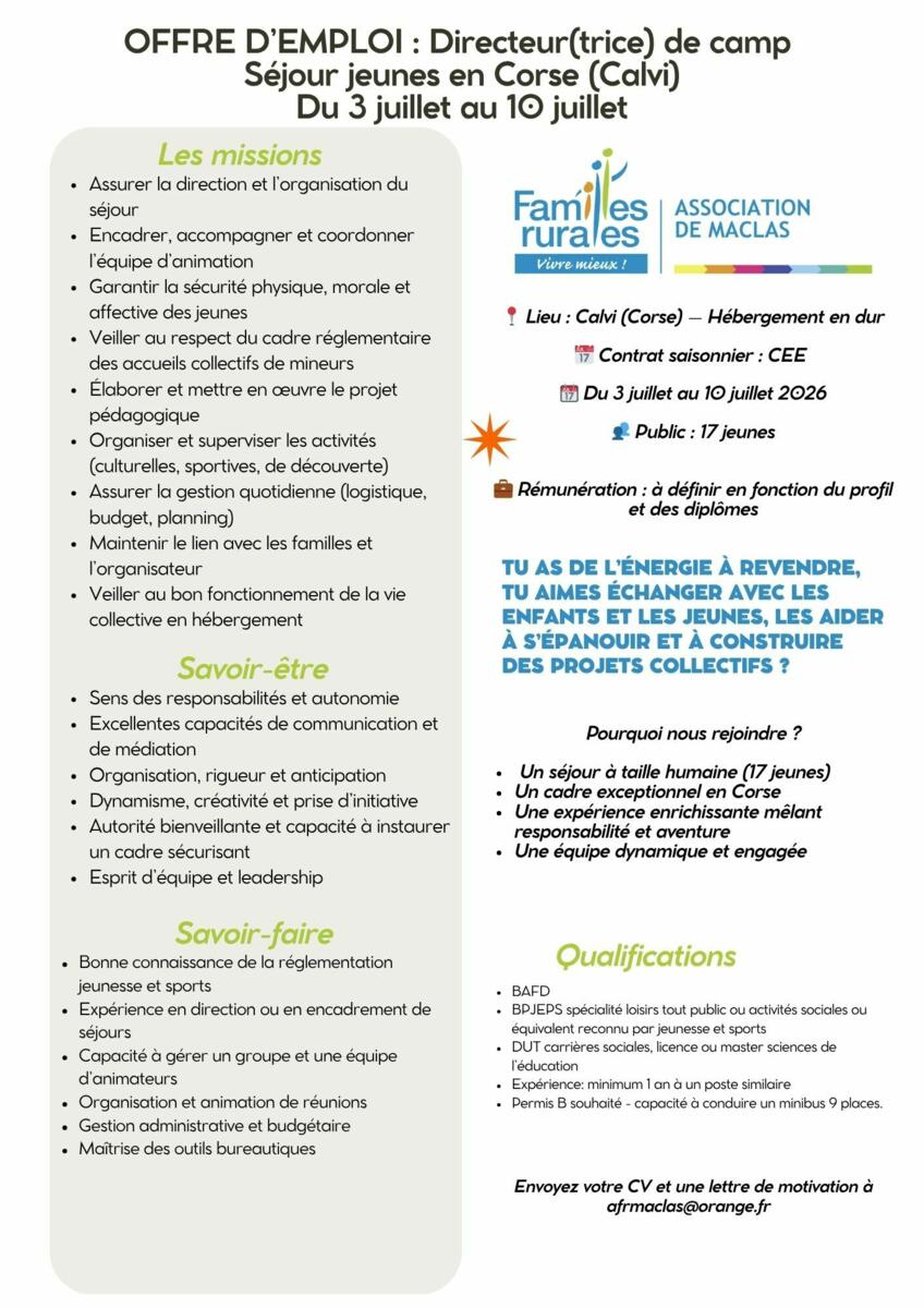 Familles rurales recherche un directeur (trice) de camp pour un séjour en Corse du 3 au 10 juillet 2026