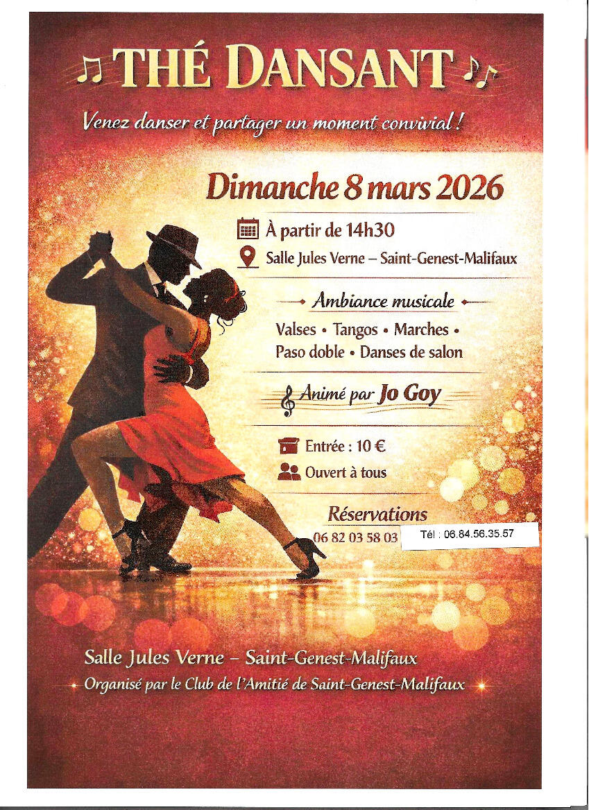Les membres du club de l’amitié de St-Genest-Malifaux vous proposent un thé dansant lors d’un après-midi convivial, animé par Jo Goy.