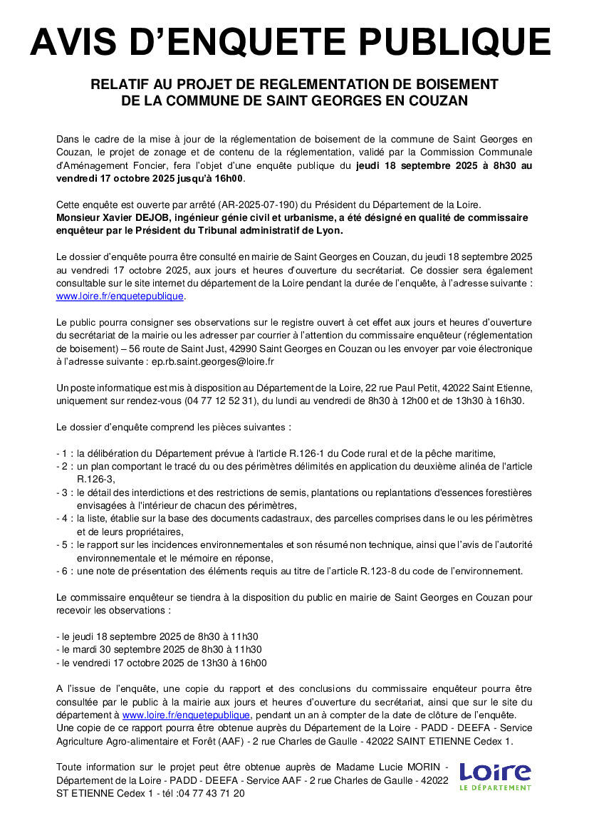 ENQUETE PUBLIQUE POUR REVISION DE LA REGLEMENTATION DES BOISEMENTS DE SAINT GEORGES EN COUZAN
